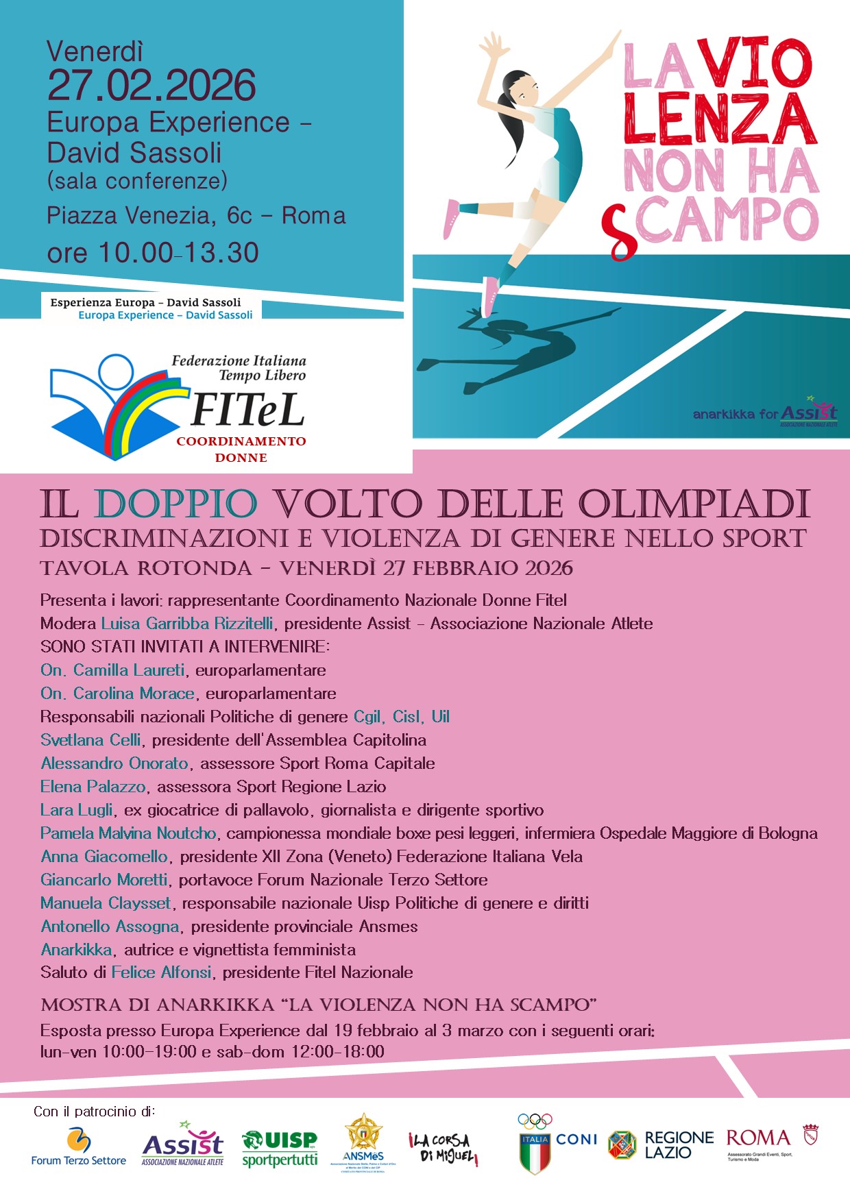 La Tavola rotonda si terrà a Roma presso la Sala conferenze di Europa Experience - David Sassoli il 27 febbraio alle ore 10.00-13.30 e riunisce nel dibattito rappresentanti politici, sindacali, del mondo dell’associazionismo sportivo e testimonianze dirette di atlete.