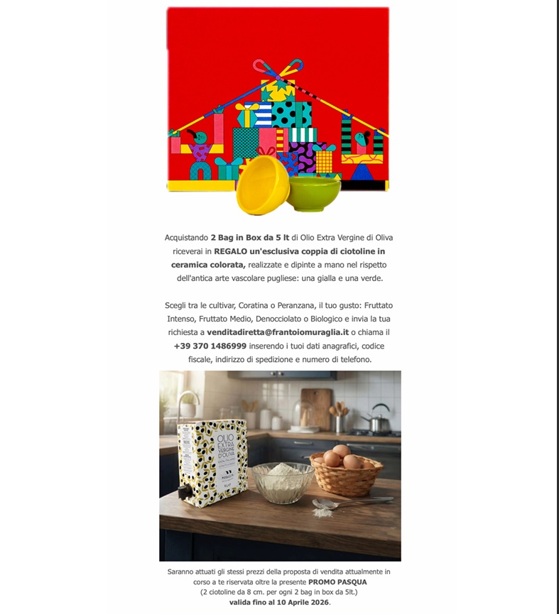 Approfittare di questa iniziativa significa portare a casa non solo un prodotto d’eccellenza, ma un’esperienza completa: il gusto autentico dell’olio extravergine e la bellezza di un oggetto artigianale che impreziosisce la tavola. Perché la Pasqua è fatta di gesti semplici, di sapori veri e di momenti da ricordare — e Frantoio Muraglia è pronto ad accompagnarvi in ogni istante di festa.